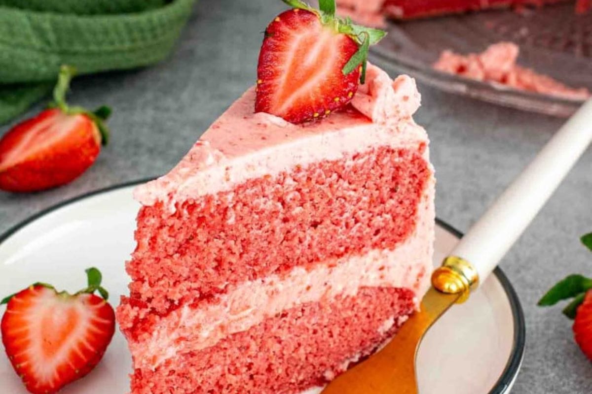 Strawberry Cake made with real strawberries and topped with strawberry buttercream. Soft, pink, and full of summer flavor.