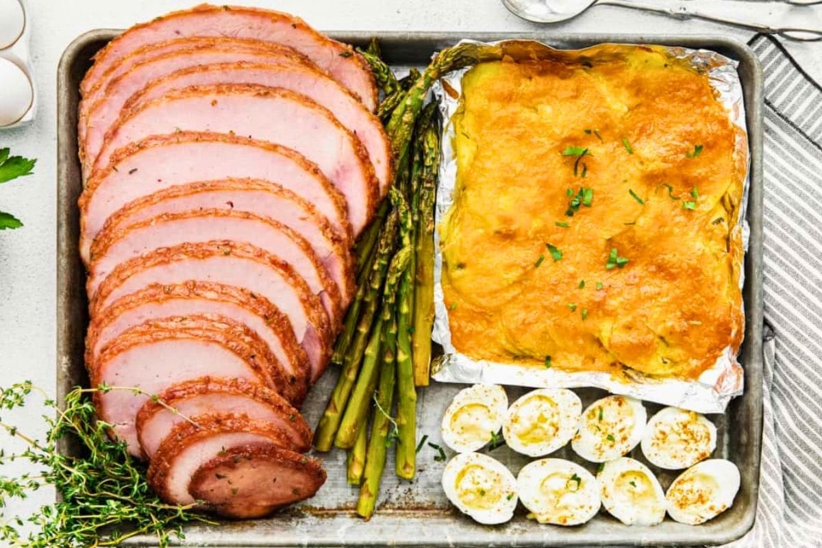 Make this easy Sheet Pan Easter Dinner recipe featuring brown sugar ham, asparagus, scalloped potatoes, and deviled eggs.