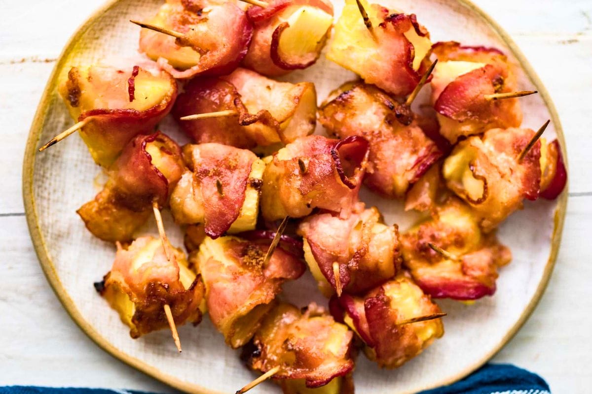 Bacon Wrapped Pineapple is such a great finger food to serve to guests at parties with the perfect mix of salty and sweet flavors. Can be served hot or cold