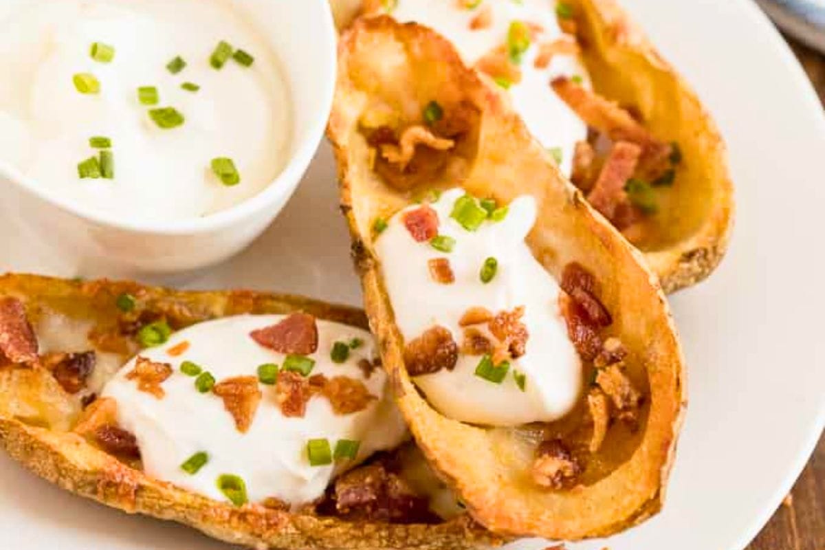 These Cheesy Potato Skins are topped with sour cream, tasty bacon and fresh green onions. This appetizer recipe is a crowd-pleasing classic.