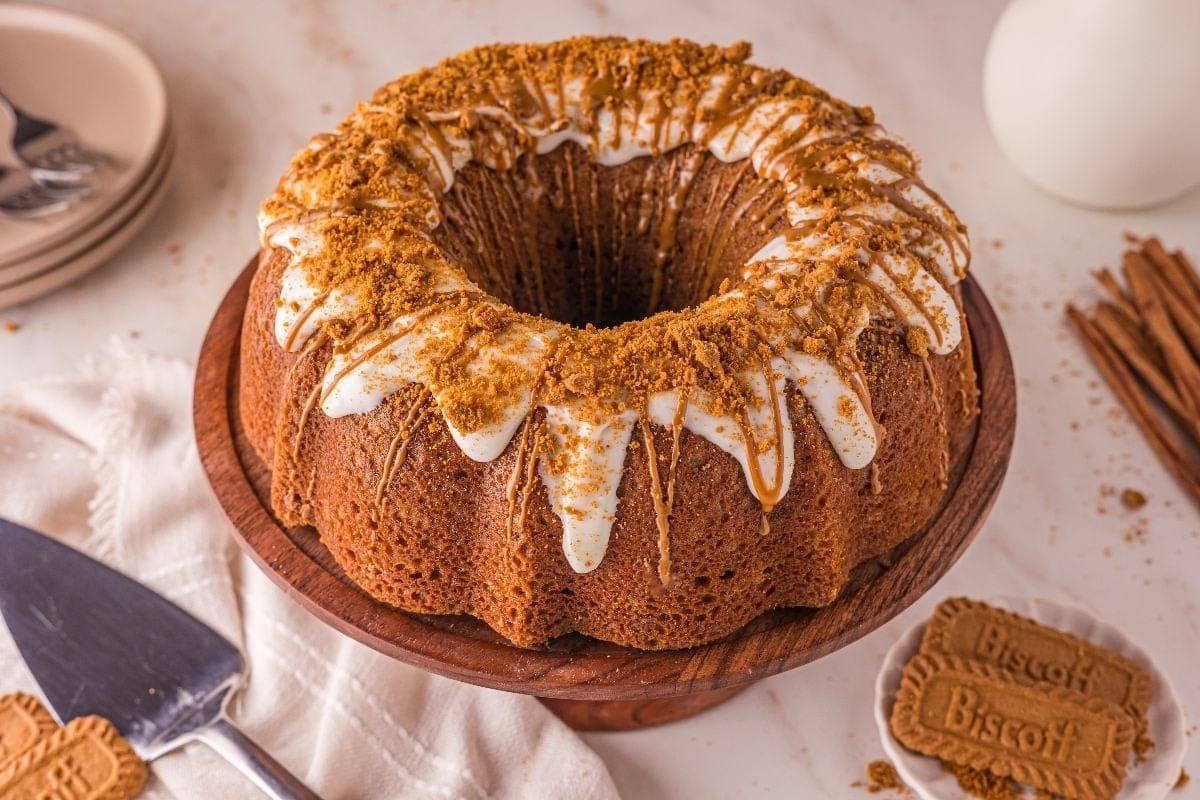 A Biscoff cake with cookie butter baked into the batter, crushed cookies throughout, and a cream cheese glaze to finish the bundt cake.
