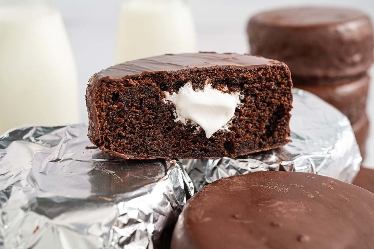 Homemade ding dongs are soft chocolate cakes with a marshmallow cream filling and a smooth chocolate coating for a nostalgic treat.