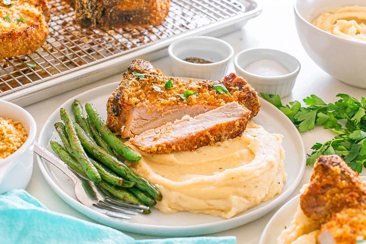 Coat homemade shake and bake pork chops with crisp panko coating and bold seasonings then bake on a sheet pan for succulent results.