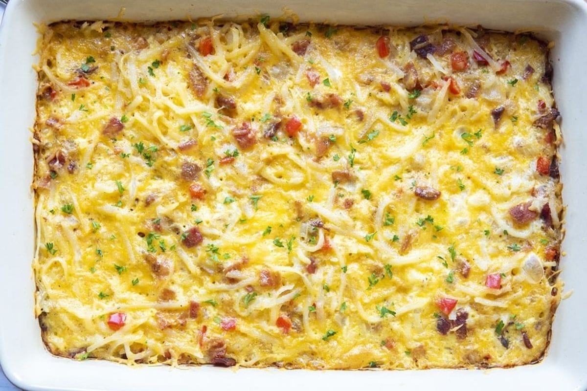 This hashbrown breakfast casserole pairs hash browns with eggs, bacon, vegetables, and Swiss cheese for a hearty and filling breakfast.