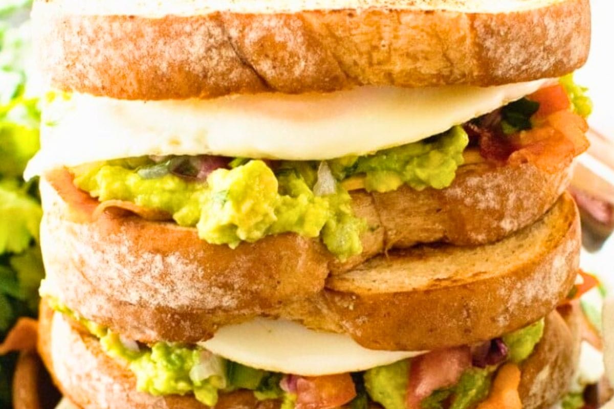 Delicious Homemade Southwestern Breakfast Sandwiches layered with cheese, bacon, an over easy egg, pico de gallo, and guacamole! This breakfast sandwich recipe will soon be your favorite!