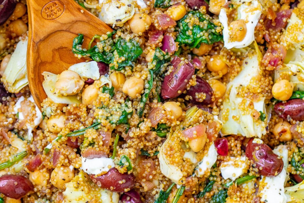 EASY quinoa salad is ready in 20 minutes with Mediterranean-inspired ingredients like chickpeas, olives, artichokes, and goat cheese!