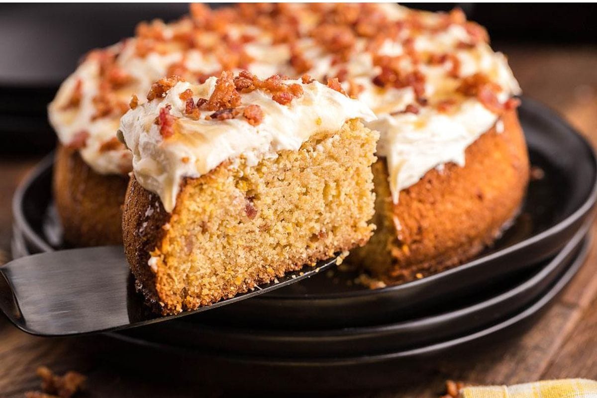This air fryer cornbread cake with candied bacon is delicious! Cornbread is delicious and everyone loves bacon! So how could this air fryer cornbread recipe with honey buttercream frosting be less than incredible!