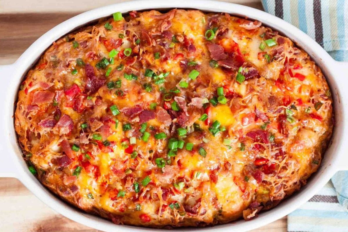 I love baking this bacon bread for brunch. The biscuits soak up the eggs and puff around the cheese and bacon. It always disappears fast.