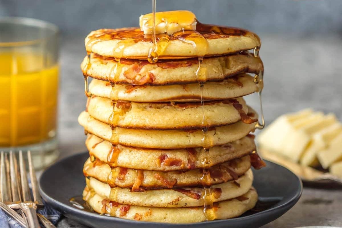 Bacon pancakes have been a family favorite for years! They’re light, fluffy, and chock-full of crunchy bits of bacon.