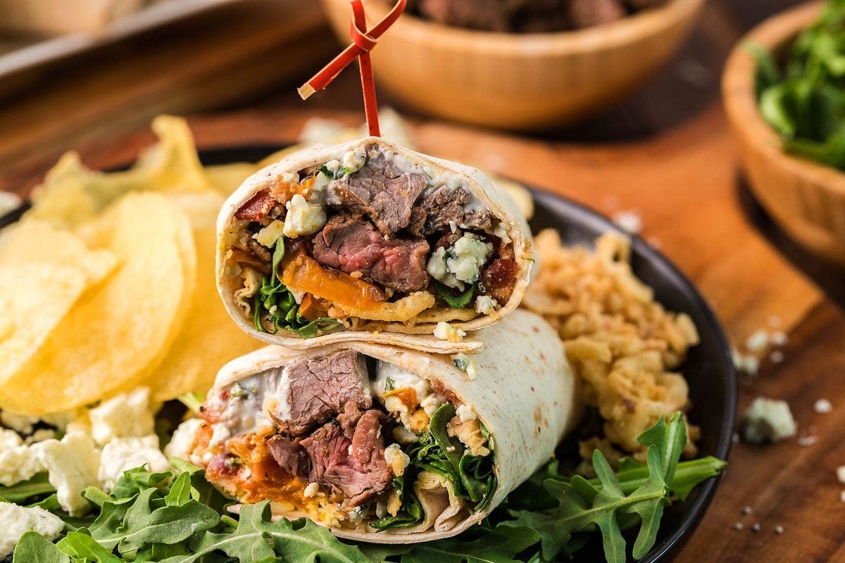 Bacon steak wraps, made with chuck steak and a homemade blue cheese dressing, are hearty, rich and delicious. If you’re wondering what to put in a steak wrap, try bacon, blue cheese crumbles and fried onions!