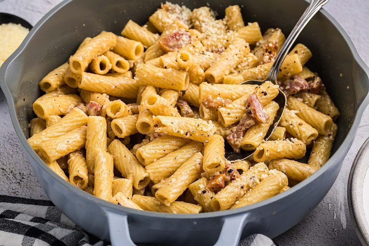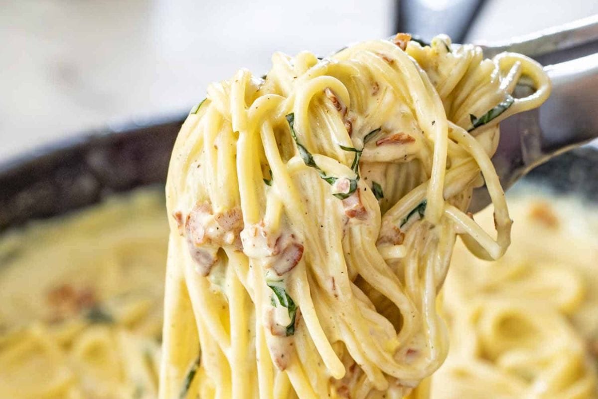 Traditional pasta alla carbonara, with spaghetti, garlic, guanciale, eggs, and parmesan has bold Italian flavors in every delicious forkful.