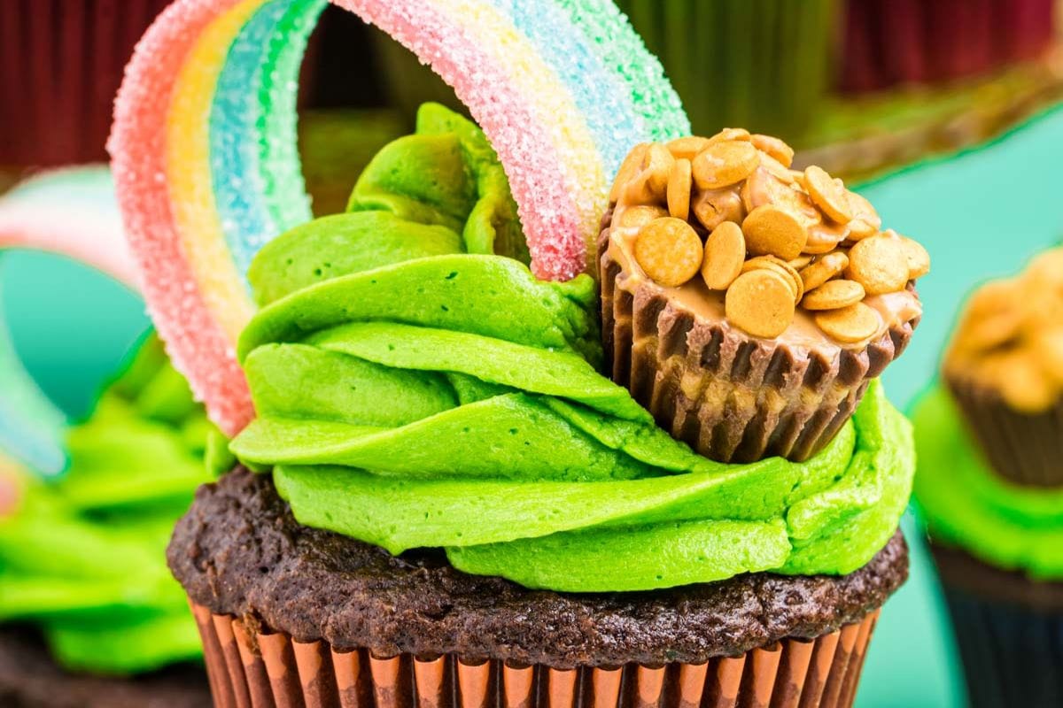 Bake these St. Patrick’s Day cupcakes with rainbow sprinkles, green buttercream and candy toppings for an adorable themed holiday treat.