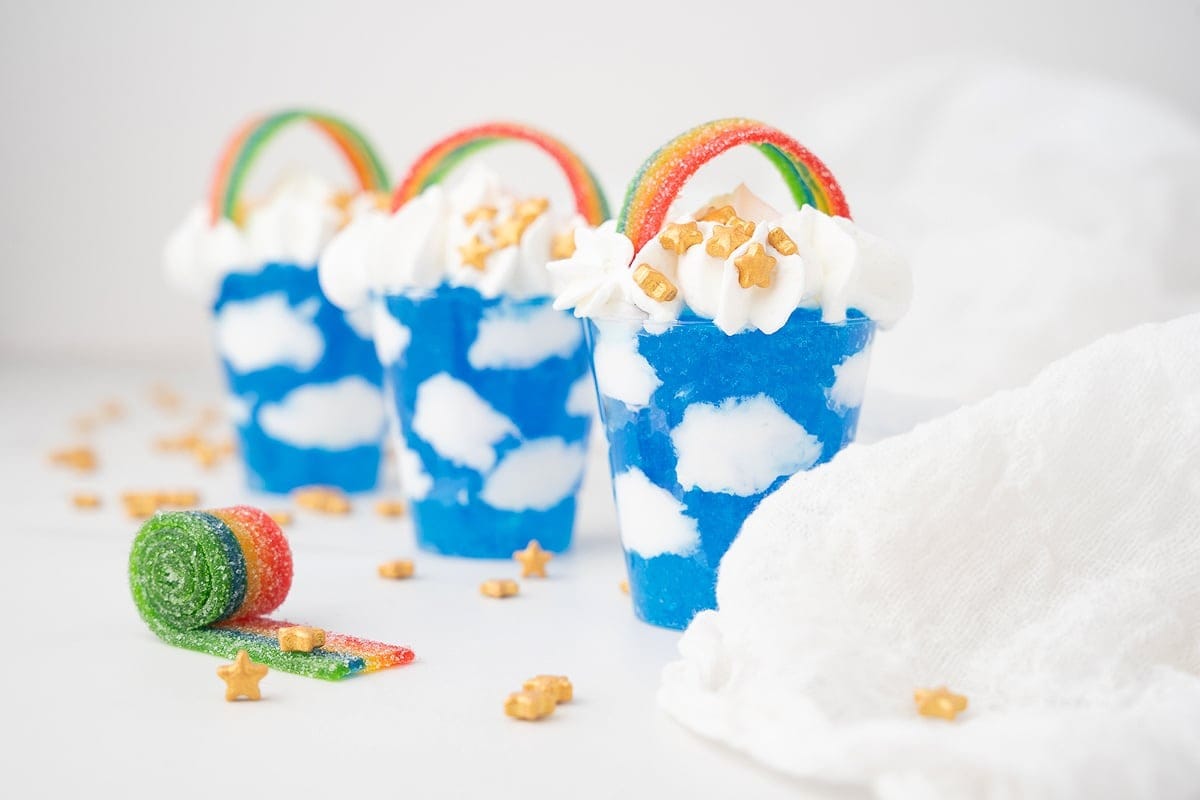 Rainbow pot o’ gold jello vodka shots layer fruity gelatin, whipped topping, candy rainbows and sprinkles for a colorful boozy party treat.