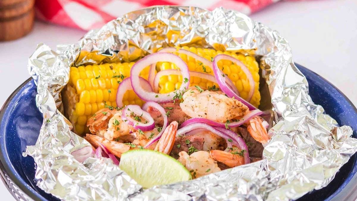 Steak and shrimp pair up with corn and red onion in these delicious surf n turf foil packs. It’s a great recipe to cook over a campfire, on the grill or even in the oven.