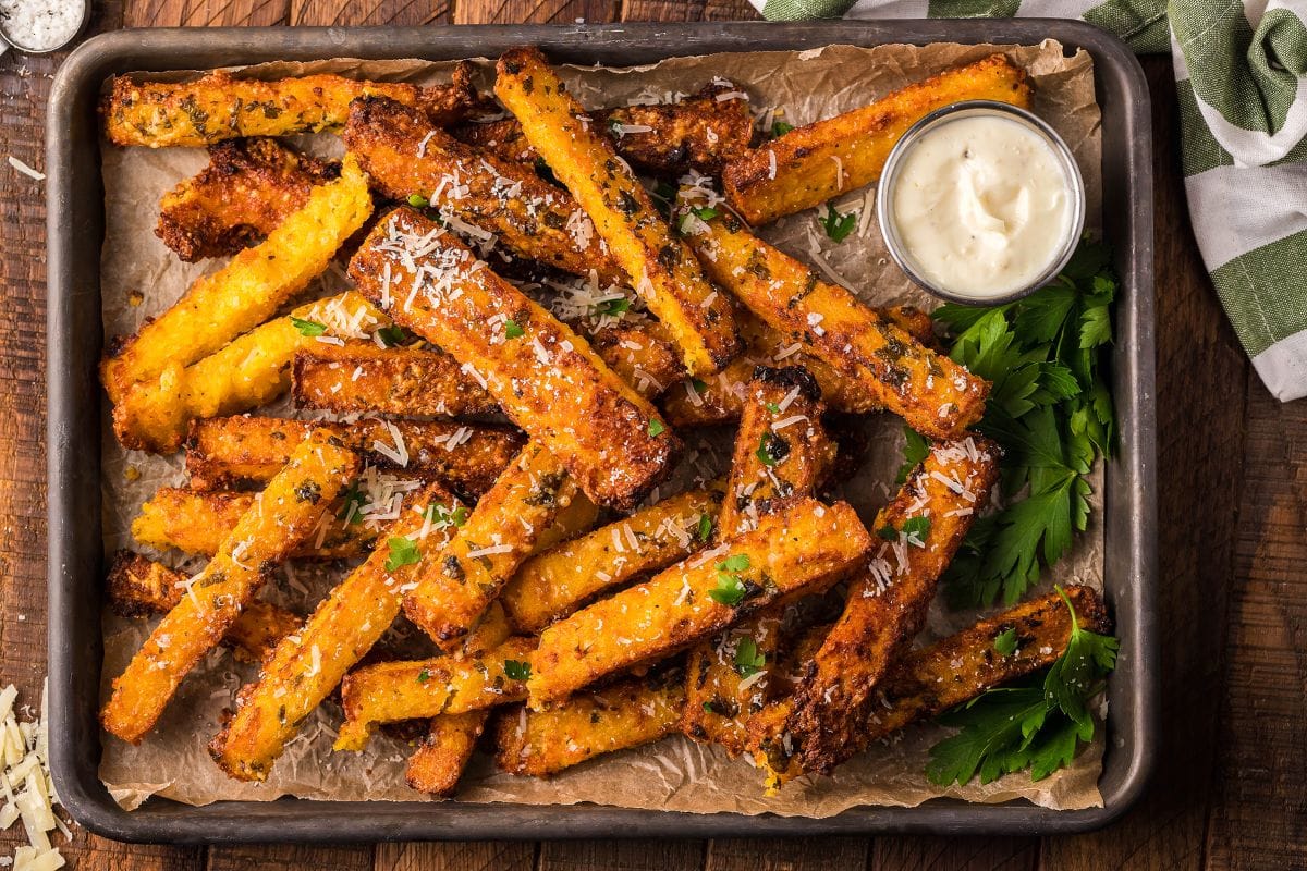 These crispy polenta sticks, flavored with parmesan and truffle, are perfect as a side dish or appetizer and can be paired with a delicious truffle mayo dipping sauce. If you serve them at your next gathering, your guests will ask for the recipe!