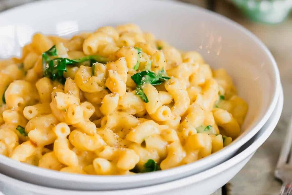 This creamy sweet potato mac and cheese combines two types of cheese, spinach, and a hint of nutmeg. It’s a healthier take on comfort food.