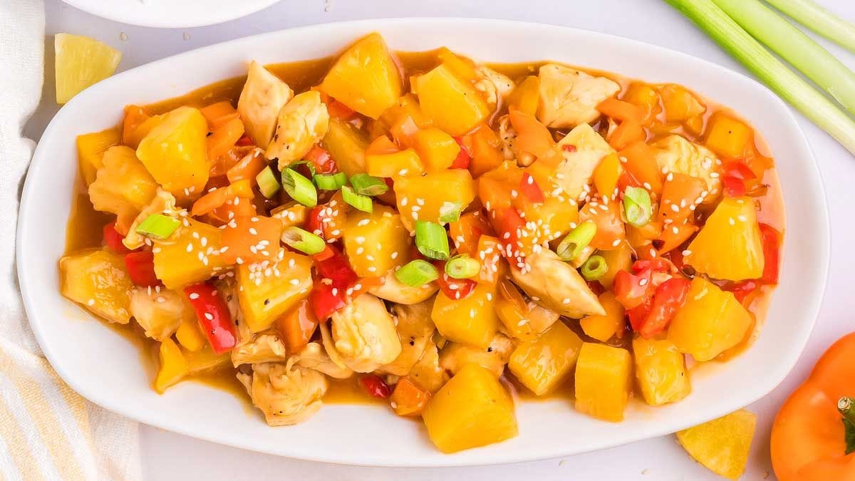 Hawaiian chicken is a flavorful combination of juicy chicken, bell peppers and pineapple chunks, along with a tangy sweet and sour sauce.