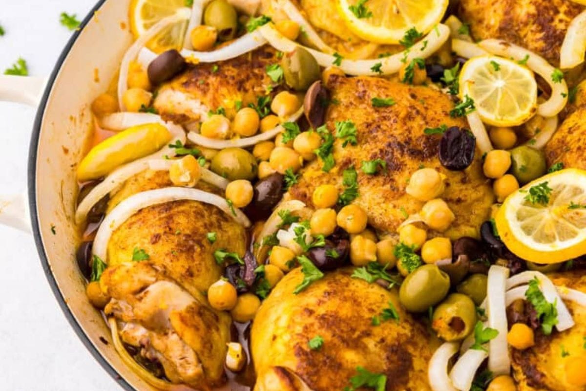Moroccan chicken thighs are tender, juicy, and full of flavor. This dish is packed with olives, lemon, chickpeas, and Moroccan spices!