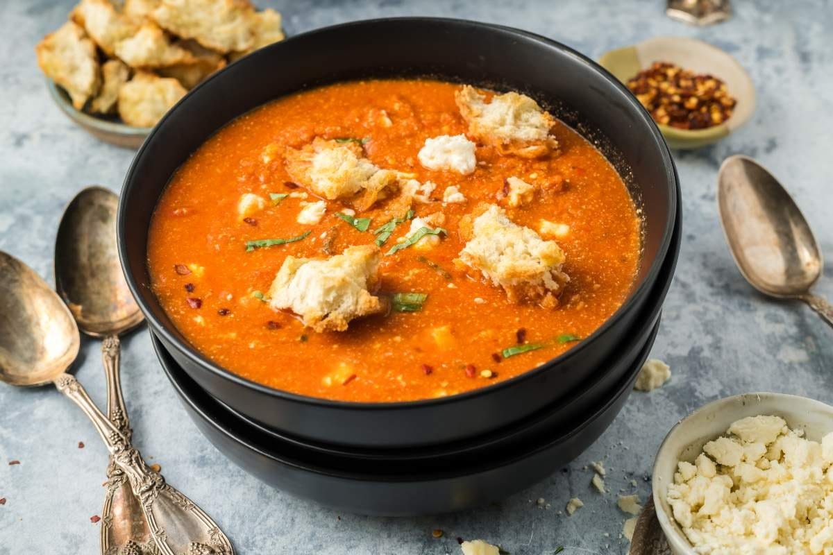 This baked feta soup blends roasted tomatoes, garlic and feta in a creamy tomato broth. It’s finished with herbs and crisp bread for texture.