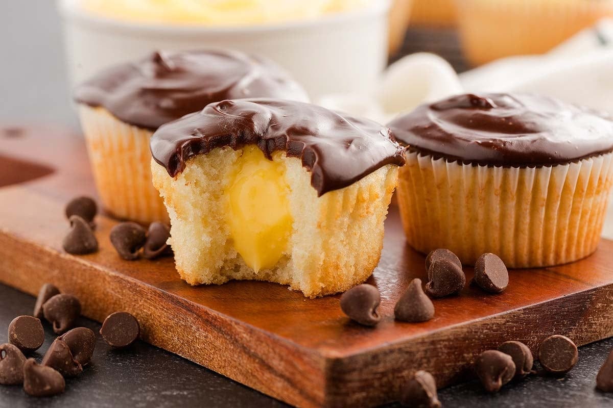 Boston cream cupcakes feature vanilla cake, pudding filling and chocolate ganache topping for a tasty dessert with rich flavor in every bite.