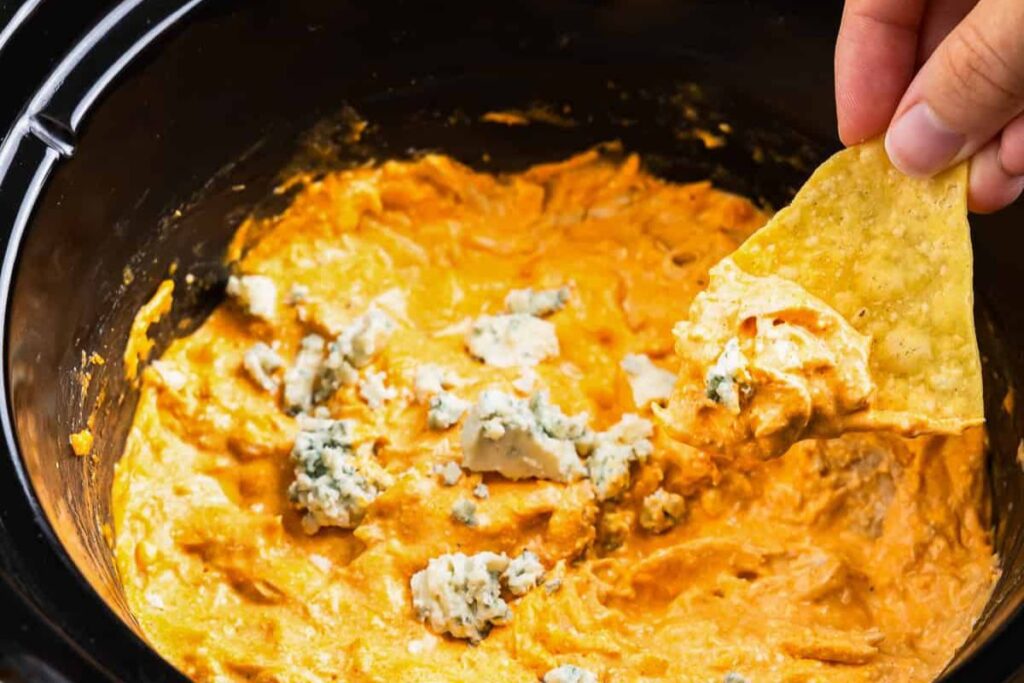Level up your appetizer game with easy Crockpot buffalo chicken dip. Made for scooping this dump and go recipe is great for entertaining.