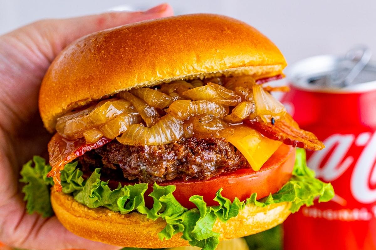 This bacon cheeseburger recipe with Coca-Cola onions is a fun and tasty grilling recipe. It has amazing flavor, is super easy, and is absolutely irresistible.