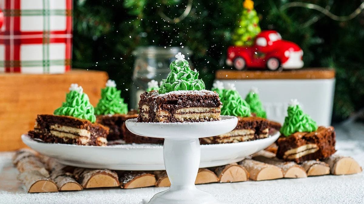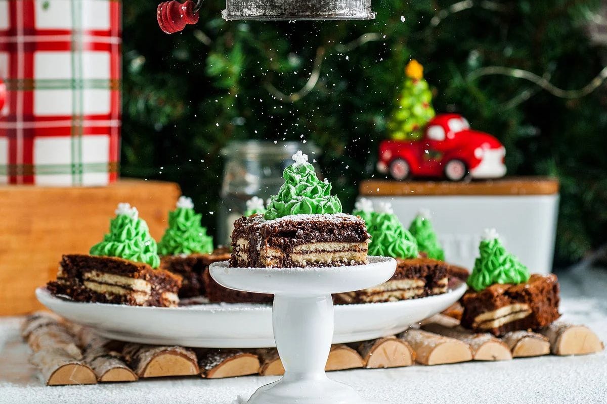 Mint Milano Christmas brownies are dense, chewy and rich. The top of these festive Christmas brownies are decorated with Christmas trees.