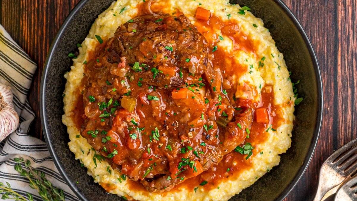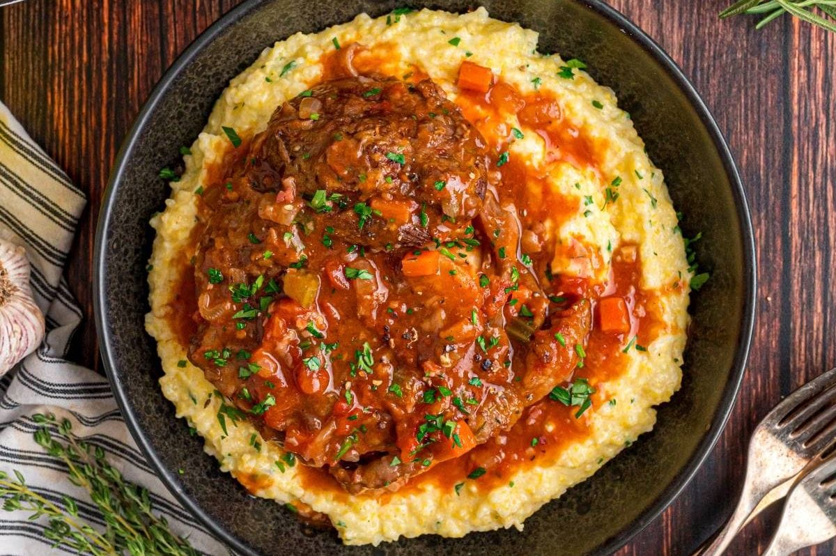 This hearty osso buco recipe is a comforting Italian classic that delivers fall-apart tender meat in a rich, savory tomato and red wine sauce. Veal shanks are slowly braised with aromatic vegetables, pancetta and herbs until deeply flavorful and tender. Served over creamy polenta or mashed potatoes, this dish is perfect for a special meal or a cozy weekend dinner. With layers of texture and warmth in every bite, it’s the kind of slow-cooked dish that always impresses.