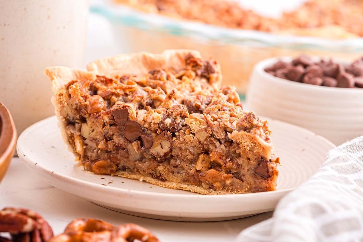 Savor a blend of sweet and salty in Texas trash pie. This more-ish dessert delivers a wide variety of flavors and textures in every bite.