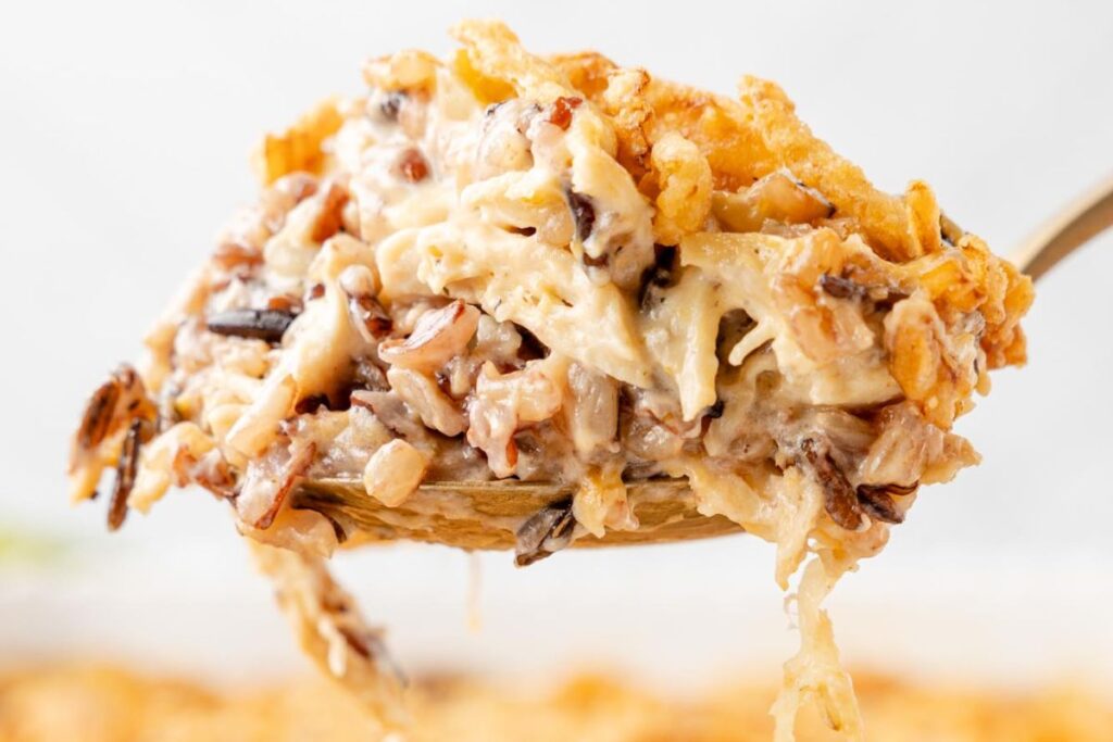 This creamy Chicken and Wild Rice Casserole is made from scratch, with a homemade sauce, shredded chicken, and topped with crispy fried onions.