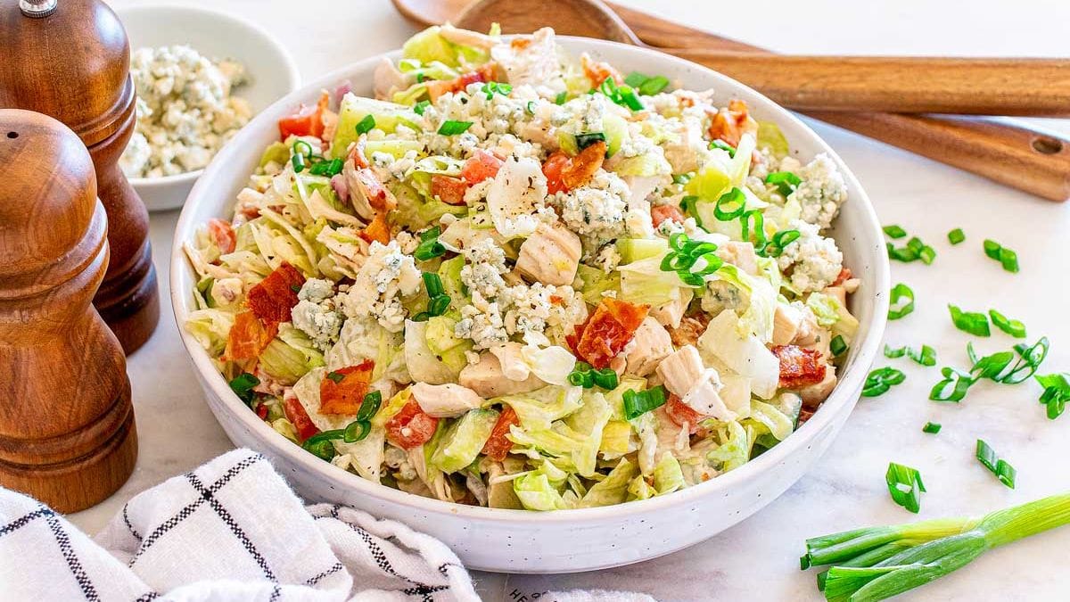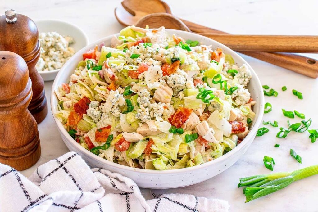 If you’re looking for a tasty appetizer or light meal, you can’t go wrong with this easy chopped chicken blue cheese salad recipe.