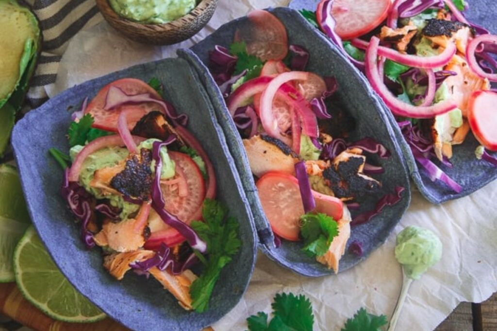 These blackened salmon tacos are topped with quick pickled radishes and red onion, an avocado cilantro cream and served on blue corn tortillas for one amazing bite!