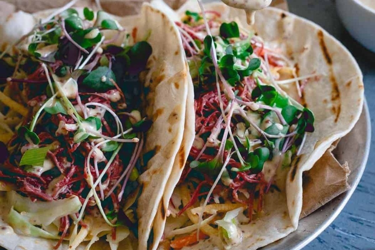 These corned beef tacos are served with a creamy spicy mustard sauce, a simple cabbage carrot slaw and topped with microgreens.