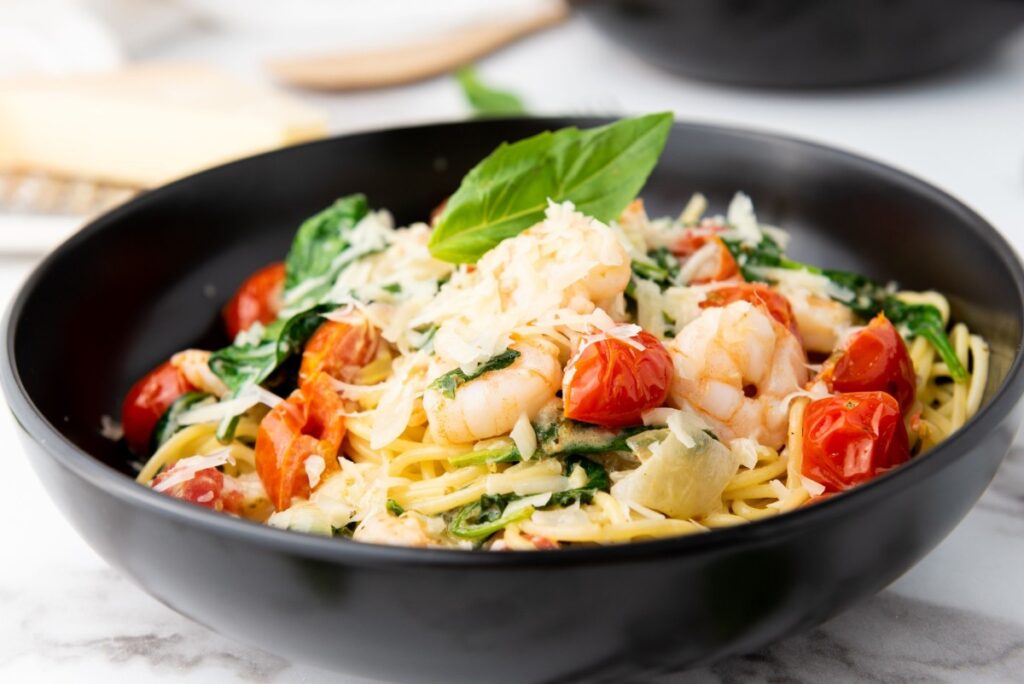 Mediterranean shrimp linguine has it all – al dente pasta, juicy shrimp, vibrant veggies, the best seasonings from the Med, and more!