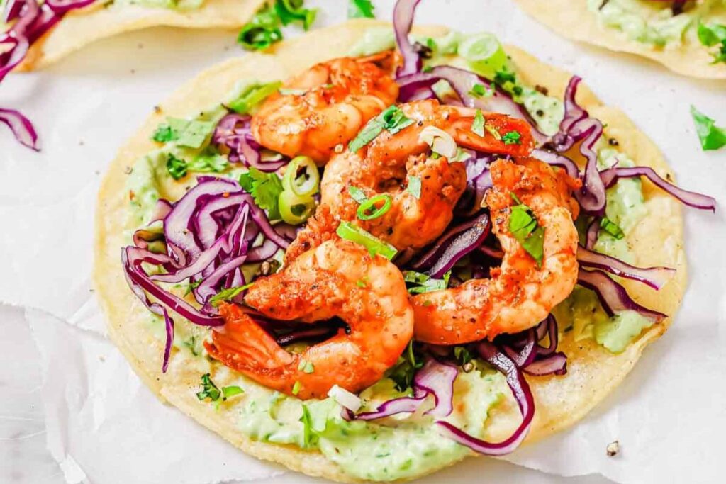 Quick and easy shrimp tostadas topped with spicy avocado crema and crunchy red cabbage slaw. Perfect for a deliciously simple seafood dinner.
