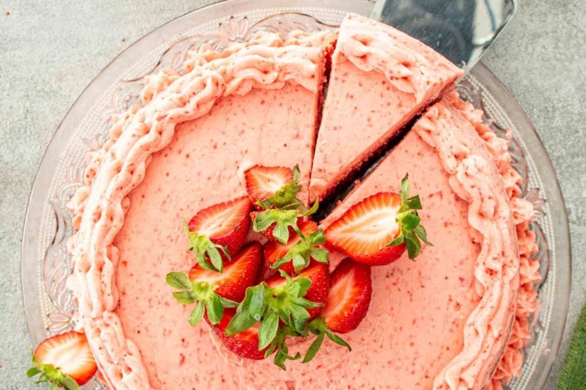 Strawberry Cake made with real strawberries and topped with strawberry buttercream. Soft, pink, and full of summer flavor.