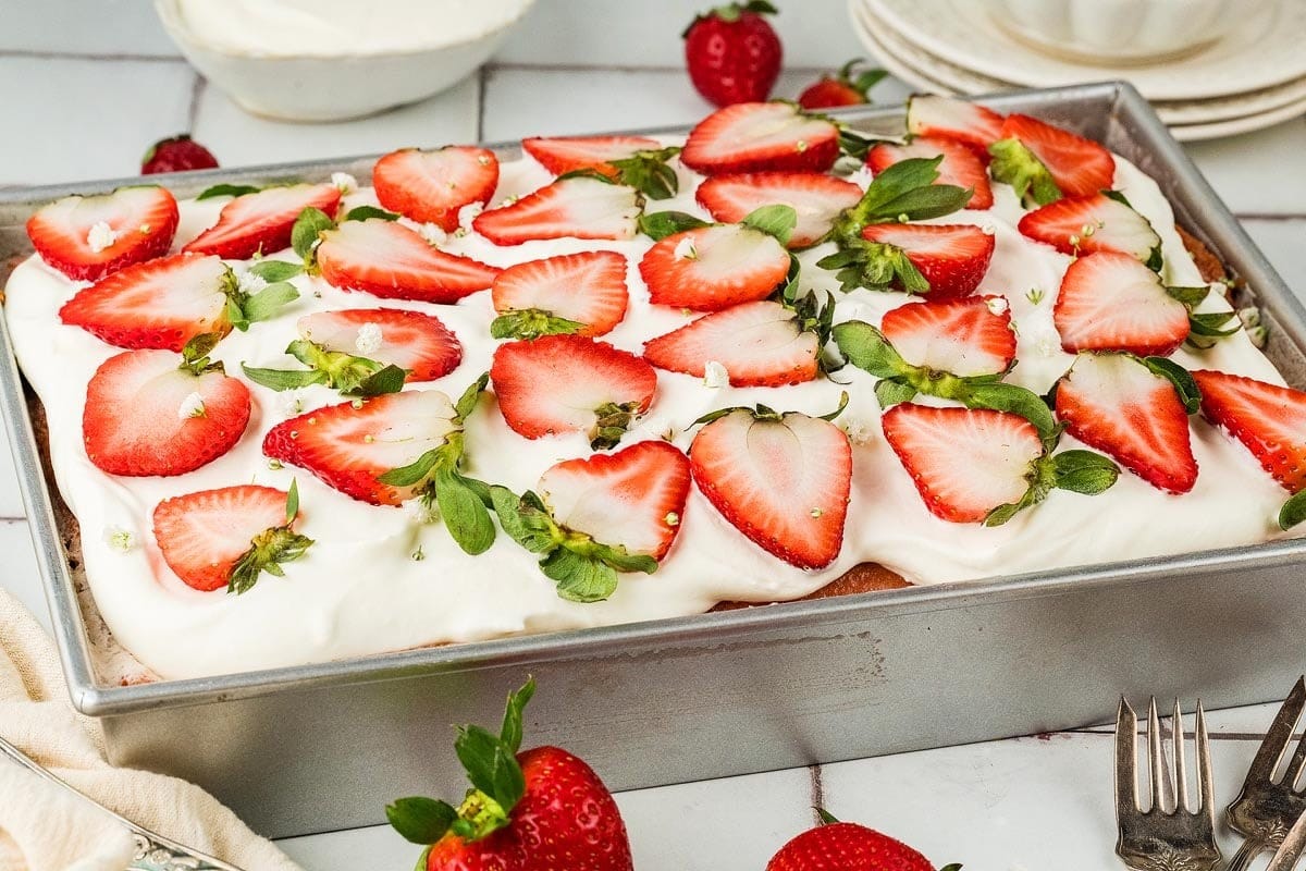 Indulge in a moist, creamy strawberry tres leches cake, perfect for any celebration with its fruity flavors. This dessert is so good!