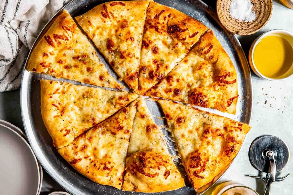 This white pizza is made without ricotta cheese, loads of mozzarella cheese and olive oil, and an abundance of garlic for restaurant-quality pizza at home!