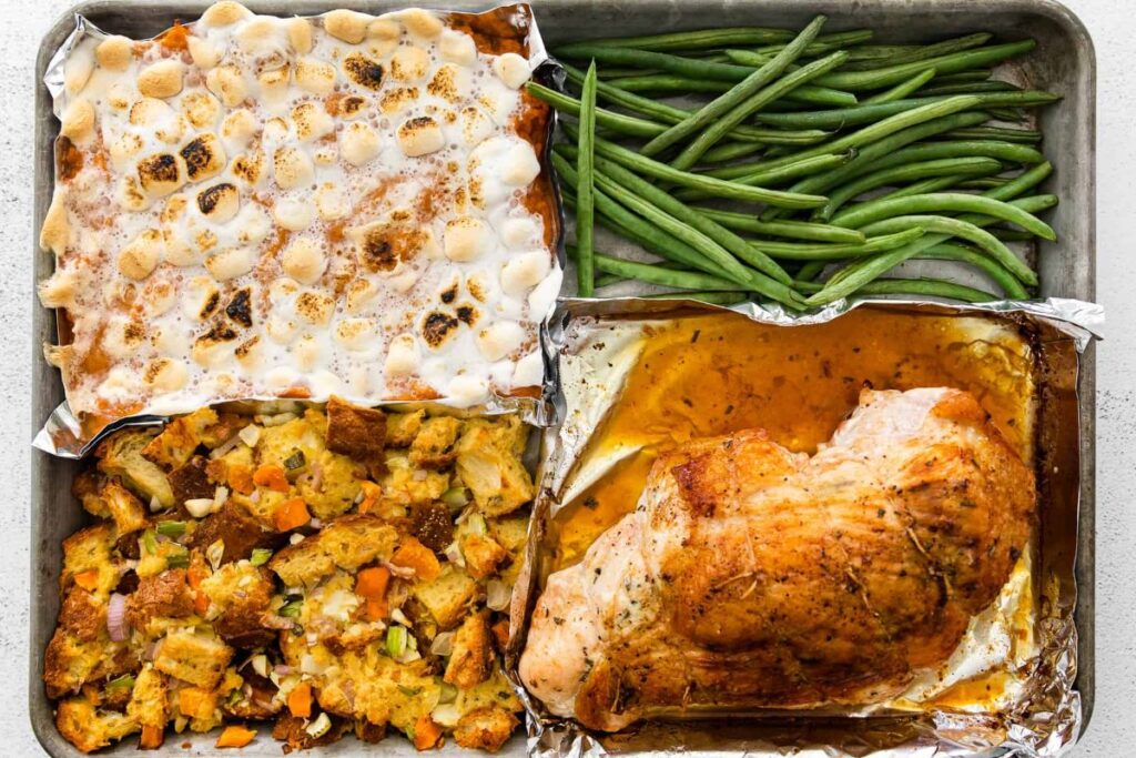 Cook up a Thanksgiving meal without the stress with this delicious sheet pan turkey breast recipe complete with all of your favorite sides.