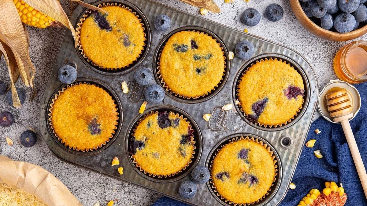 Blueberry cornbread muffins are gluten-free and honey-sweetened with a tender crumb. Lemon zest and juicy berries keep every bite bright.