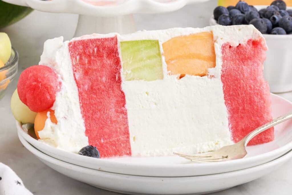 This impressive watermelon cake is a fun cake made with layers of juicy watermelon, cantaloupe and honeydew, all covered in a light, sweet whipped cream frosting.